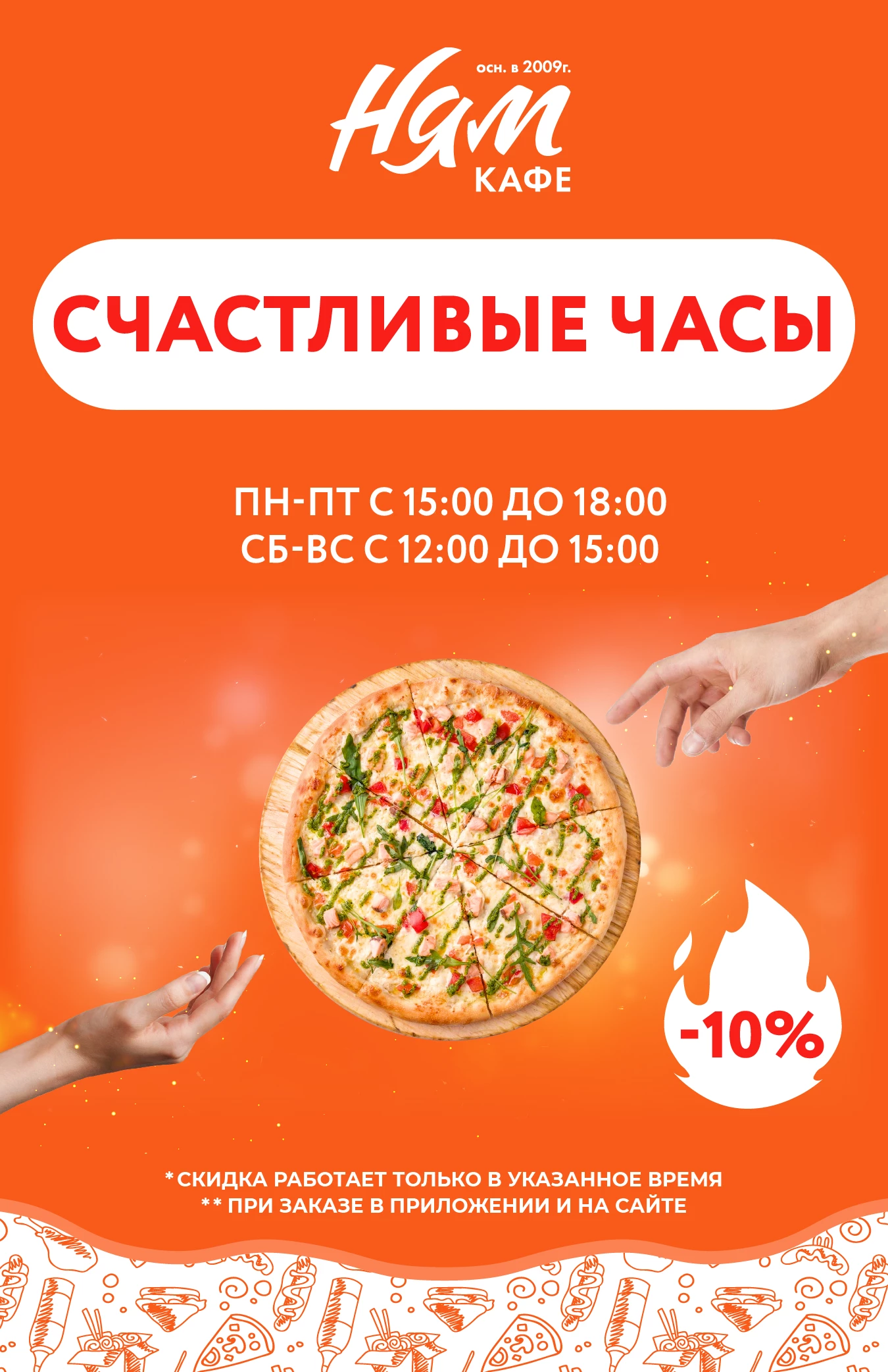 Состав пиццы: Бекон, говядина, домашний фарш, охотничьи колбаски, шампиньоны, соус томатный, сыр