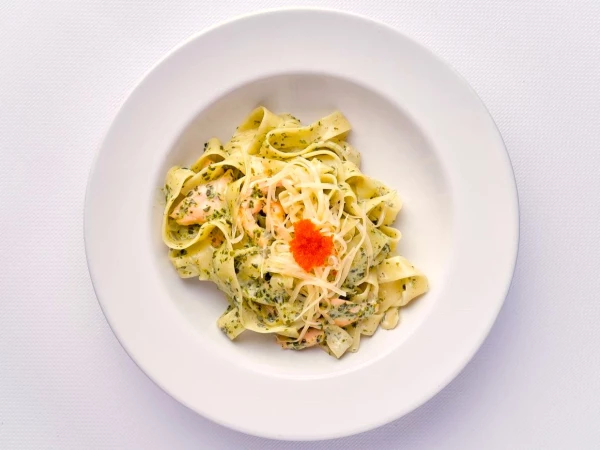 Состав пиццы: Лосось с/м, Помидоры, Сыр, Руккола, Соус песто, соус сливочный