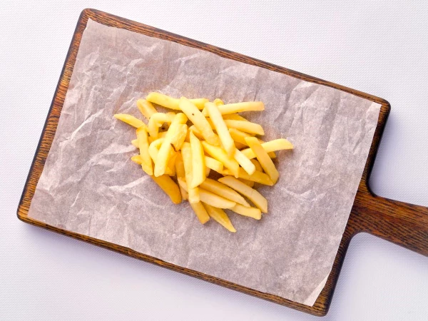 Состав пиццы: Сосиски молочные, картофель фри, соус томатный, сыр
