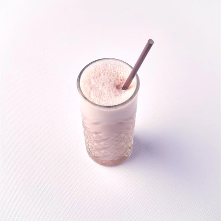 В состав коктейля входит: Молоко, мороженое, клубничный топпинг